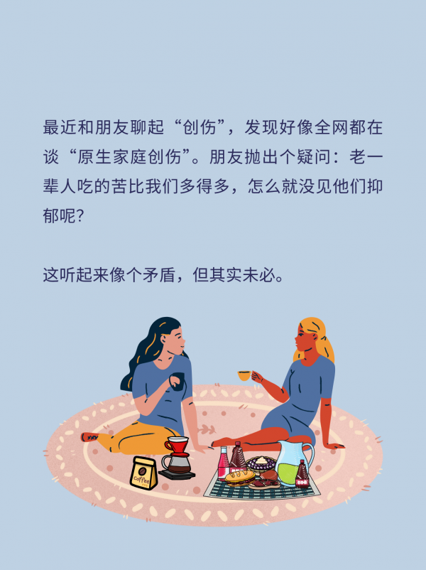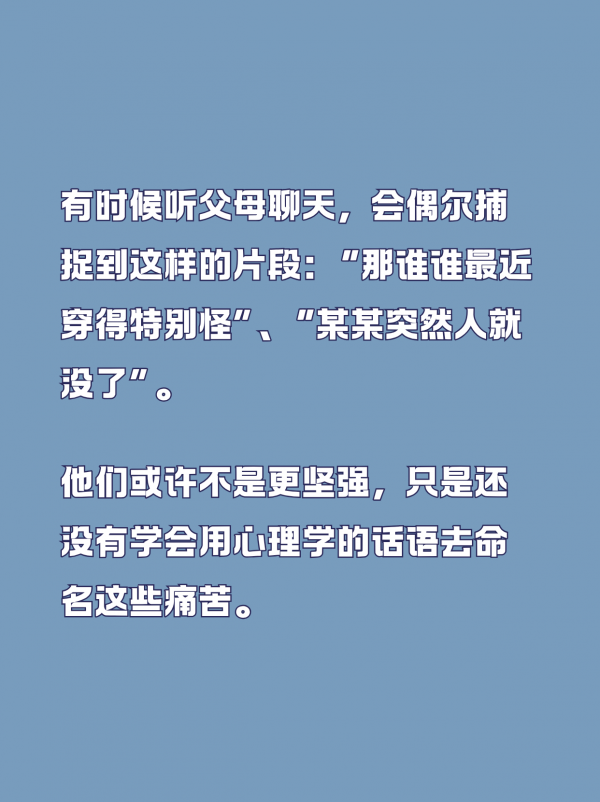 有时候听父母聊天,会偶尔捕捉到这样的片段:“那谁谁最近穿得特别怪”“某某突然人就没了”。他们或许不是更坚强,只是还没有学会用心理学的话语去命名这些痛苦。