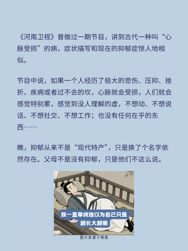 《河南卫视》曾做过一期节目,讲到古代一种叫“心脉受损”的病,症状描写和现在的抑郁症惊人地相似:如果一个人经历了极大的悲伤、压抑、挫折、疾病或者过不去的坎,心脉就会受损,他们就会感觉特别累,感觉到没人理解的虚,不想动、不想说话、不想社交、不想工作;也没有任何在乎的东西……瞧,抑郁从来不是“现代特产”,只是换了个名字依然存在。我们的父母不是没有抑郁,只是他们不这么说。