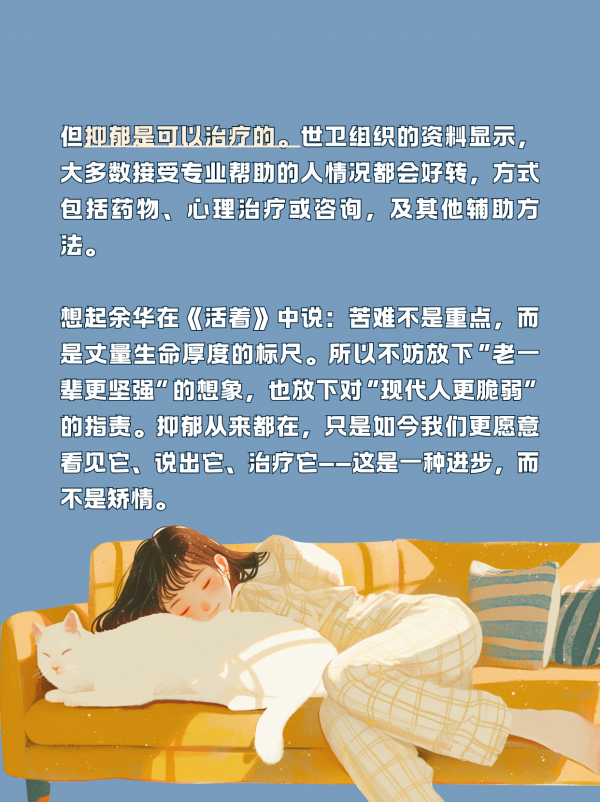想起余华在《活着》中说:苦难不是重点,而是丈量生命厚度的标尺。所以不妨放下“老一辈更坚强”的想象,也放下对“现代人更脆弱”的指责。抑郁从来都在,只是如今我们更愿意看见它、说出它、治疗它——这是一种进步,而不是矫情。