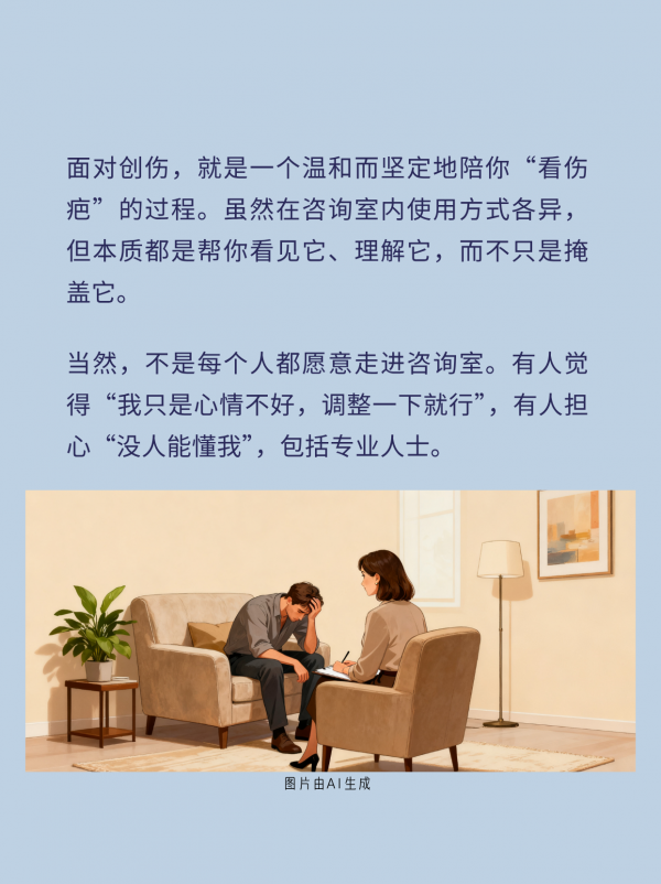 面对创伤,就是一个温和而坚定地陪你“看伤疤”的过程。虽然在咨询室内使用方式各异,但本质都是帮你看见它、理解它,而不只是掩盖它。当然,不是每个人都愿意走进咨询室。有人觉得“我只是心情不好,调整一下就行”,有人担心“没人能懂我”,包括专业人士。